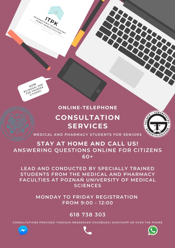 Students of Poznan University of Medical Sciences under the supervision of academic teachers from the Geriatrics Department of Palliative Medicine (Prof. K. Wieczorowska-Tobis and Dr A. Neumann-Duringka) have started an Internet-Telephone Consultation Point (itPK) run by Medical and Pharmacy Students aimed at Seniors in response to the COVID-19 pandemic. These activities are dedicated to people over 60 years of age.