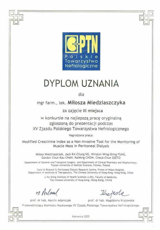 Z satysfakcją informujemy, że Pracownik Katedry i Zakładu Farmacji Klinicznej i Biofarmacji - Pan mgr farm., lek. Miłosz Miedziaszczyk otrzymał dyplom uznania za zajęcie III miejsca w konkursie na najlepszą pracę oryginalną zgłoszoną do prezentacji podczas XV Zjazd Polskiego Towarzystwa Nefrologicznego.