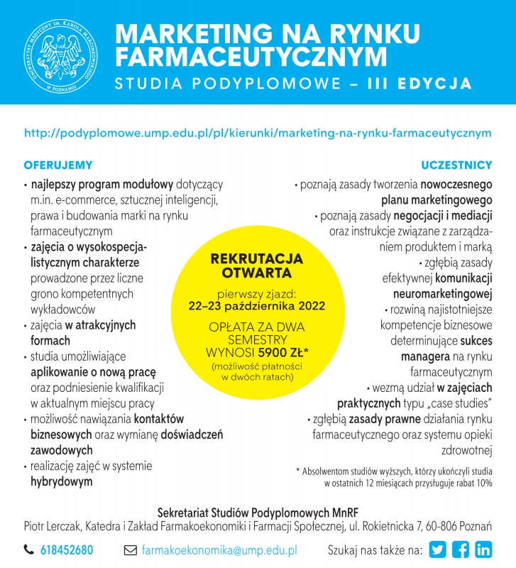 z przyjemnością informujemy o otwartym naborze na III edycję studiów podyplomowych "Marketing na rynku farmaceutycznym" organizowanych przez Katedrę i Zakład Farmakoekonomiki i Farmacji Społecznej Uniwersytetu Medycznego w Poznaniu.
