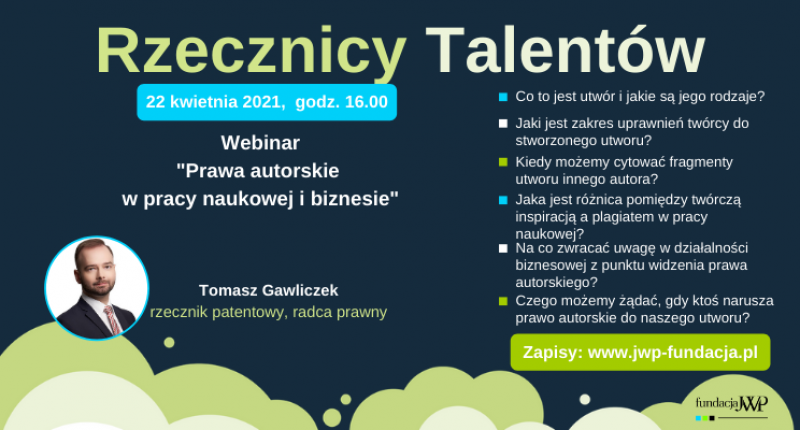 22 kweitnia porozmawiamy o „Prawach autorskich w pracy naukowej i biznesie”. Temat bardzo wszystkim potrzebny, dlatego zachęcamy gorąco do wzięcia udziału w webinarze, który poprowadzi radca prawny i rzecznik patentowy Tomasz Gawliczek.