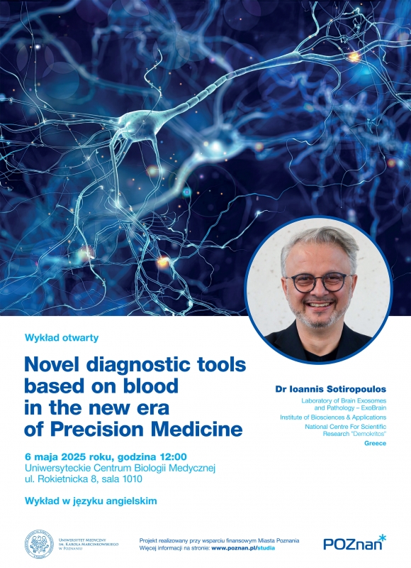 Centrum Medycyny Doświadczalnej Uniwersytetu Medycznego im. Karola Marcinkowskiego w Poznaniu oraz Miasto Poznań zapraszają na wykład otwarty pt. "Novel diagnostic tools based on blood in the new era of Precision Medicine", który wygłosi Dr Ioannis Sotiropoulos. Wydarzenie odbędzie się 6 maja 2025 r. (wtorek) o godz. 12:00 w sali 1010 (parter) Centrum Biologii Medycznej, ul. Rokietnicka 8, Poznań.