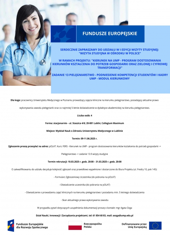 Serdecznie zapraszamy pracowników Uniwersytetu Medycznego w Poznaniu prowadzących zajęcia kliniczne na kierunku pielęgniarstwo, posiadających aktualne prawo wykonywania zawodu pielęgniarki oraz co najmniej 5-letnie doświadczenie w dydaktyce akademickiej na kierunku pielęgniarstwo do udziału w I edycji Wizyty studyjnej „Wizyta studyjna w Polsce” w ramach Projektu „Kierunek na UMP - program dostosowania kierunków kształcenia do potrzeb gospodarki oraz zielonej i cyfrowej transformacji”, realizowanego w ramach Programu Fundusze Europejskie dla Rozwoju Społecznego Działanie FERS.01.05 Umiejętności w szkolnictwie. Nr umowy: FERS.01.05-IP.08-0357/23-00.