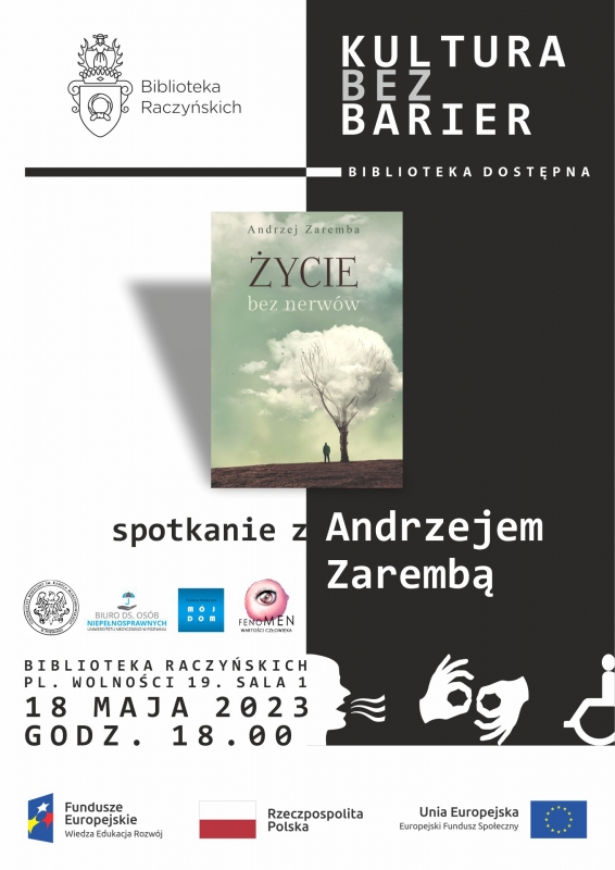 Jest to kolejne wydarzeniem z cyklu Kultura bez barier, które organizuje Biblioteka Raczyńskich. Tym razem jednak, znosimy bariery, które stoją nie tylko przed Czytelnikami, ale i przed Autorem. Pan Andrzej Zaremba od dziesięciu lat choruje na stwardnienie boczne zanikowe (SLA).