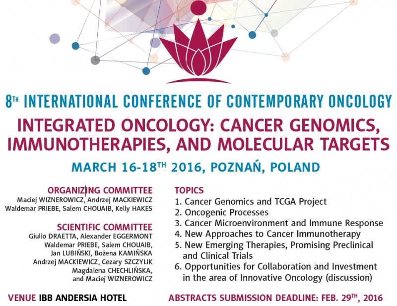 Data wydarzenia: 16 marca 2016W dniach 16-18 marca 2016 w Poznaniu odbędzie się 8th International Conference of Contemporary Oncology, Cancer Genomics, Immunotherapies and Targets. W prestiżowym wydarzeniu wezmą udział światowej rangi naukowcy i eksperci w dziedzinie onkologii oraz bioinformatyki, a także wybitni onkolodzy i polscy badacze raka.