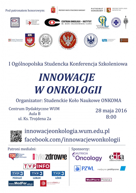 Data wydarzenia: 28 maja 2016„Innowacje w onkologii” stanowią już trzecią konferencję w dorobku organizacyjnym Studenckiego Koła Naukowego Onkoma przy Klinice Gastroenterologii Onkologicznej w Centrum Onkologii - Instytut im. Marii Skłodowskiej-Curie w Warszawie. W/w spotkanie to swoiste nawiązanie do pierwszej inicjatywy Koła - Studenckiej Konferencji „Najczęstsze nowotwory złośliwe w Polsce” (24 kwietnia 2015 roku w Auli im. Prof. Grucy w Szpitalu Dzieciątka Jezus w Warszawie; 200 uczestników biernych).