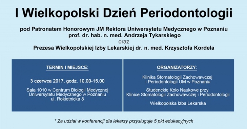 Data wydarzenia: 3 czerwca 2017Serdecznie zapraszamy do udziału w I Wielkopolskim Dniu Periodontologii pod Patronatem Honorowym JM Rektora Uniwersytetu Medycznego w Poznaniu prof. dr. hab. n. med. Andrzeja Tykarskiego oraz Prezesa Wielkopolskiej Izby Lekarskiej dr. n. med. Krzysztofa Kordela.