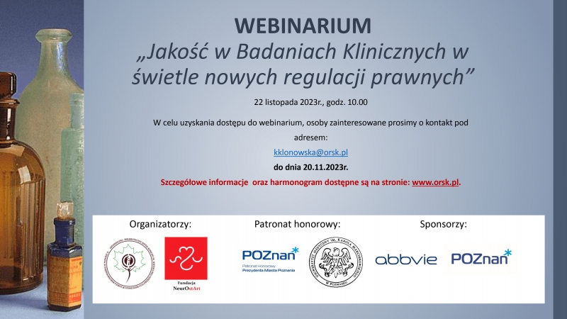 jest nam niezmiernie miło poinformować, że nasz Ortopedyczno-Rehabilitacyjny Szpital Kliniczny im. Wiktora Degi Uniwersytetu Medycznego im. Karola Marcinkowskiego w Poznaniu - we współpracy z Fundacją NeurOstArt - organizuje Webinarium pt. „Jakość w Badaniach Klinicznych w świetle nowych regulacji prawnych”, które odbędzie się w dniu 22 listopada 2023 r. o godz. 10:00.