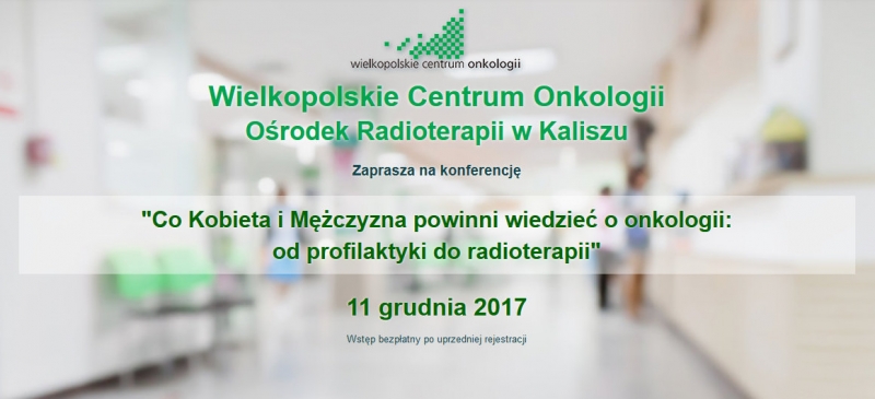 Data wydarzenia: 11 grudnia 201711 grudnia 2017 r. w filii Wielkopolskiego Centrum Onkologii w Kaliszu (ul. Kaszubska 12) odbędzie się konferencja pt.: "Co Kobieta i Mężczyzna powinni wiedzieć o onkologii: od profilaktyki do radioterapii".