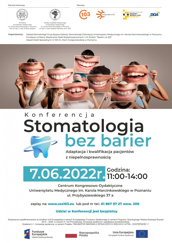 w imieniu Organizatorów, tj. Zakładu Stomatologii Grup Ryzyka Katedry Stomatologii Dziecięcej Uniwersytetu Medycznego im. Karola Marcinkowskiego w Poznaniu oraz Fundacji na Rzecz Wspierania Osób Niepełnosprawnych i ich Rodzin „Razem na 103” i Zespołu Szkół Specjalnych nr 103 im. Marii Grzegorzewskiej w Poznaniu mamy zaszczyt zaprosić do udziału w Konferencji „Stomatologia bez barier: adaptacja i kwalifikacja pacjentów z niepełnosprawnością”.