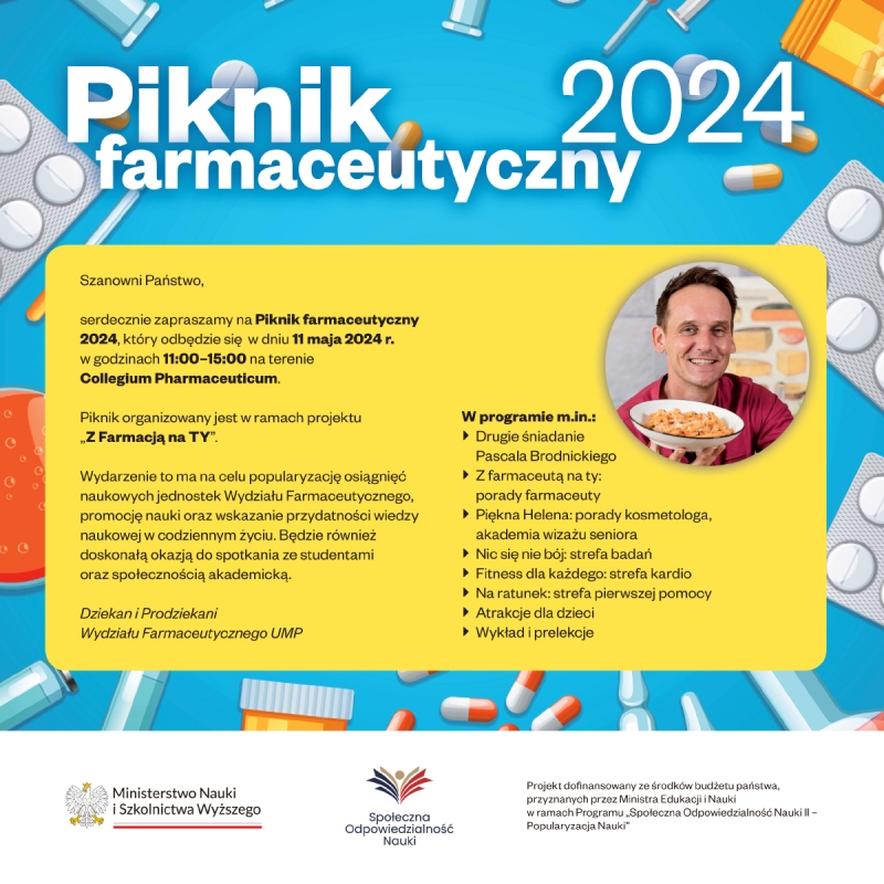 serdecznie zapraszamy na Piknik farmaceutyczny 2024, który odbędzie się w dniu 11 maja 2024 r. w godzinach 11:00-15:00 na terenie Collegium Pharmaceuticum.
