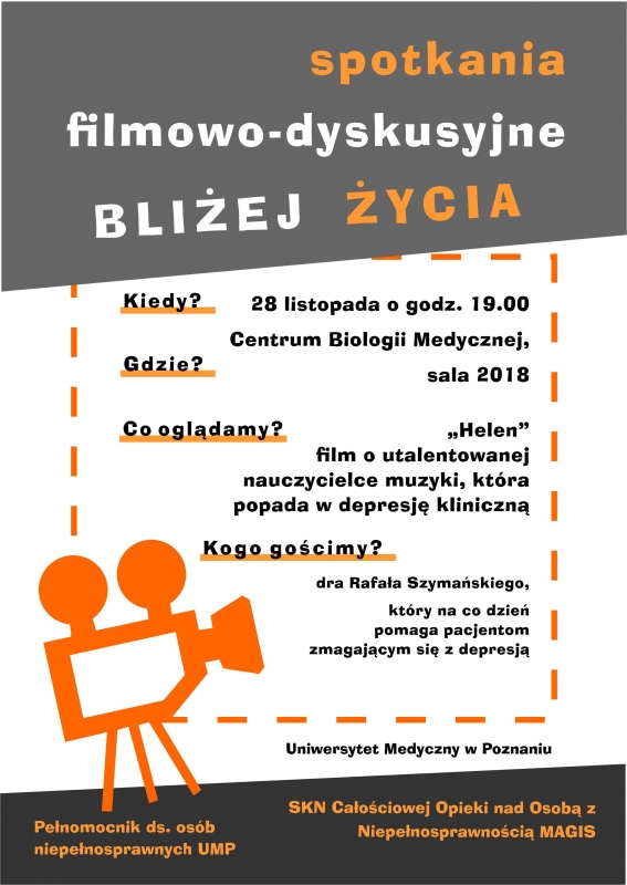 Data wydarzenia: 28 listopada 2018SKN Całościowej Opieki nad Osobą z Niepełnosprawnością MAGIS serdecznie zaprasza na pierwsze spotkanie filmowo-dyskusyjne z cyklu "Bliżej życia" w roku akademickim 2018/2019. Spotkania filmowo-dyskusyjne będą odbywały się co miesiąc i na każdym z nich, poprzez obejrzenie filmu i dyskusję, będziemy zgłębiać tematykę innej jednostki chorobowej.
