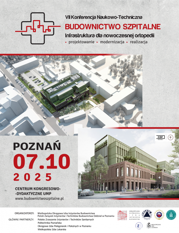 Data wydarzenia: 11 sierpnia 2025Wielkopolska Okręgowa Izba Inżynierów, Polski Związek Inżynierów i Techników Budownictwa Oddział w Poznaniu, Polski Związek Inżynierów i Techników Sanitarnych, Politechnika Poznańska, Okręgową Izbą Pielęgniarek i Położnych w Poznaniu oraz Wielkopolska Izba Lekarska zapraszają do udziału w VII Konferencji Naukowo-Technicznej „Budownictwo Szpitalne” – wydarzenie, które od lat gromadzi czołowych ekspertów z zakresu architektury, inżynierii, zarządzania oraz nowoczesnych technologii stosowanych w placówkach medycznych. Tegoroczna konferencja, odbywająca się 7 października 2025 r. w Poznaniu, poświęcona będzie wyzwaniom w projektowaniu szpitali ortopedycznych – specjalistycznych placówek, które muszą łączyć nowoczesne rozwiązania technologiczne, ergonomię przestrzeni i wysoką czystość powietrza na przykładzie Szpitala Ortopedyczno-Rehabilitacyjnego im. W. Degi w Poznaniu.