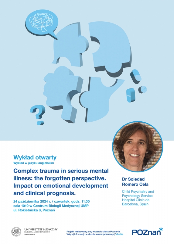 Data wydarzenia: 24 października 2024Wydział Medyczny Uniwersytetu Medycznego im. Karola Marcinkowskiego oraz Miasto Poznań zapraszają na wykład otwarty pt. "Complex trauma in serious mental illness: The forgotten perspective. Impact on emotional development and clinical prognosis", który wygłosi Dr Soledad Romero Cela (Child Psychiatry and Psychology Service Hospital Clinic de Barcelona, Spain).