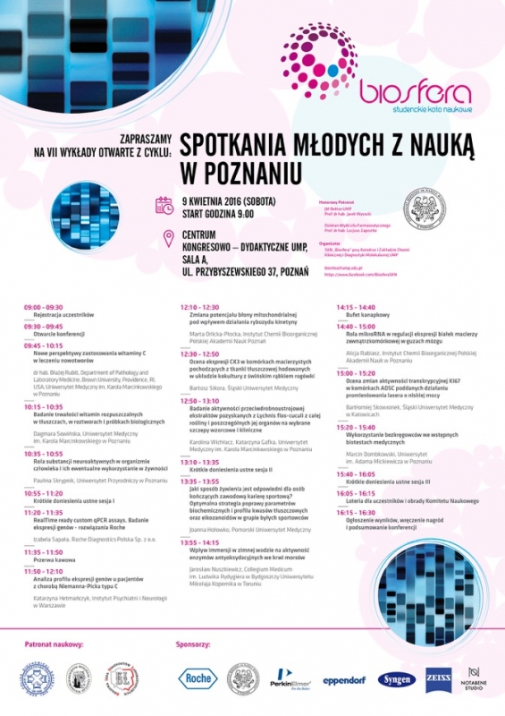 W dniu 9 kwietnia 2016 r. (sobota) już po raz siódmy odbędą się Wykłady Otwarte z cyklu „Spotkania Młodych z Nauką w Poznaniu” organizowane przez Studenckie Koło Naukowego „Biosfera” działające przy Katedrze i Zakładzie Chemii Klinicznej i Diagnostyki Molekularnej Uniwersytetu Medycznego im. K. Marcinkowskiego w Poznaniu.