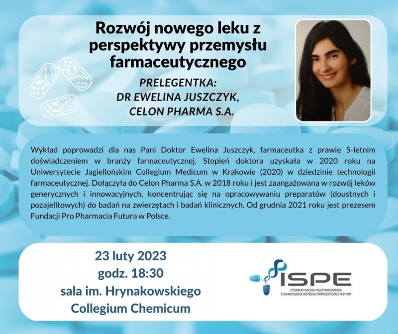 Data wydarzenia: 23 lutego 2023Studencki Oddział Międzynarodowego Stowarzyszenia Inżynierii Farmaceutycznej przy UMP zaprasza serdecznie wszystkich studentów na spotkanie z dr n. farm. Eweliną Juszczyk z Celon Pharma S.A.