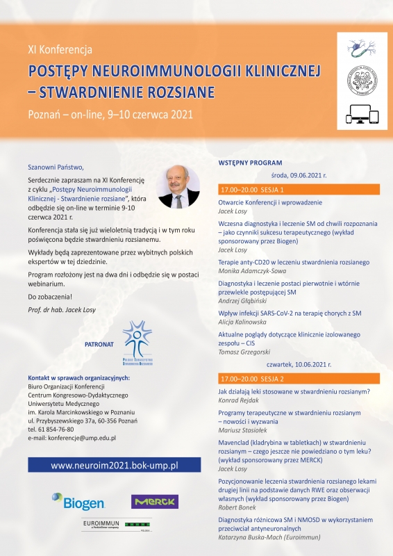 w imieniu Organizatora, Prof. dr hab. Jacka Losy, serdecznie zapraszamy do udziału w XI Konferencji z cyklu "Postępy Neuroimmunologii Klinicznej - Stwardnienie rozsiane", która odbędzie się on-line w terminie 9-10 czerwca 2021 r.